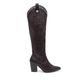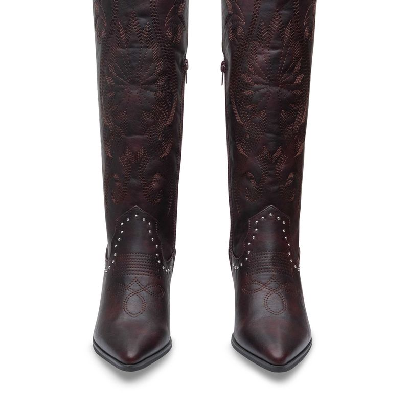 La clásica esencia western se reinventa en esta bota alta negra con detalles que marcan estilo. Su tubo presenta un bordado decorativo profundo que realza la textura y la silueta, mientras que la parte superior está adornada con ojillos metálicos y una presilla con botón que aporta un toque vaquero moderno. El tacón alto tipo bloque estiliza la figura sin sacrificar estabilidad, y la línea de estoperoles alrededor del empeine complementa un look lleno de actitud.