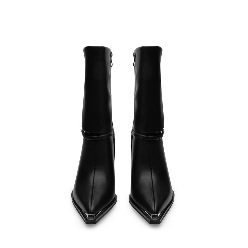 Esta bota negra destaca por su diseño limpio y su tacón geométrico que aporta un aire arquitectónico al look. El tubo recto estiliza la pierna y la parte superior del empeine lleva una aplicación metálica discreta que moderniza el diseño. Su punta afilada incluye un detalle metálico que añade carácter y sofisticación, creando un contraste perfecto con el acabado suave del material. Una opción ideal para looks urbanos y nocturnos.