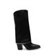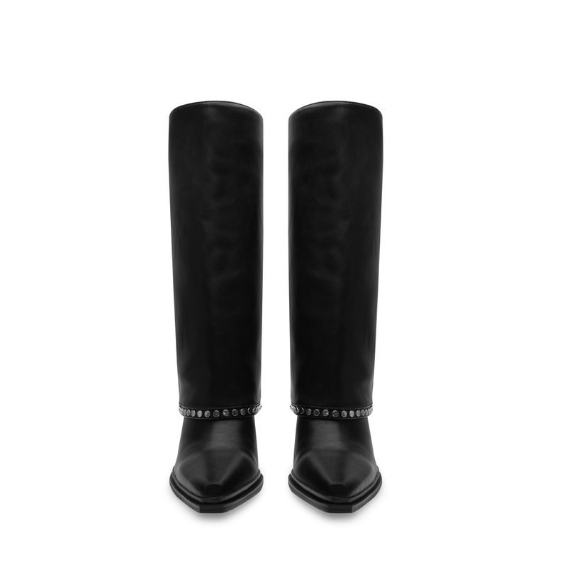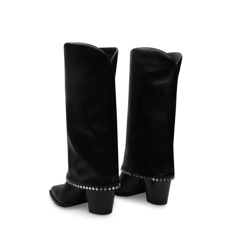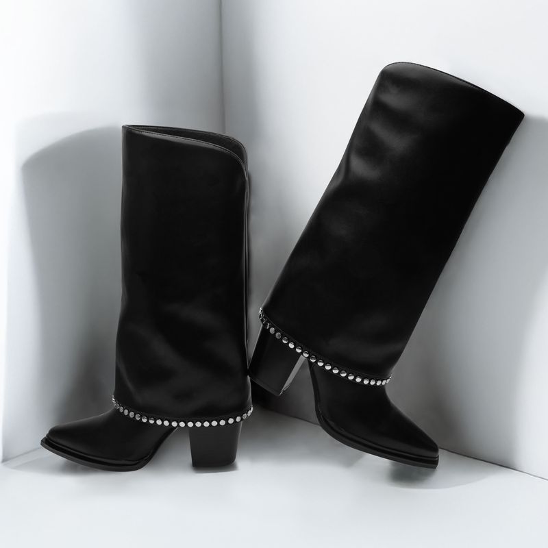 Esta bota negra tipo slouch destaca por su caída suave y natural en el tubo, creando un efecto relajado que se equilibra con la fuerza del tacón ancho. En la parte baja del tubo incorpora una línea de estoperoles metálicos en acabado plata, aportando brillo sutil. Es una pieza versátil que combina con jeans ajustados, leggings o faldas, perfecta para darle un toque más atrevido a tus looks del día a día.