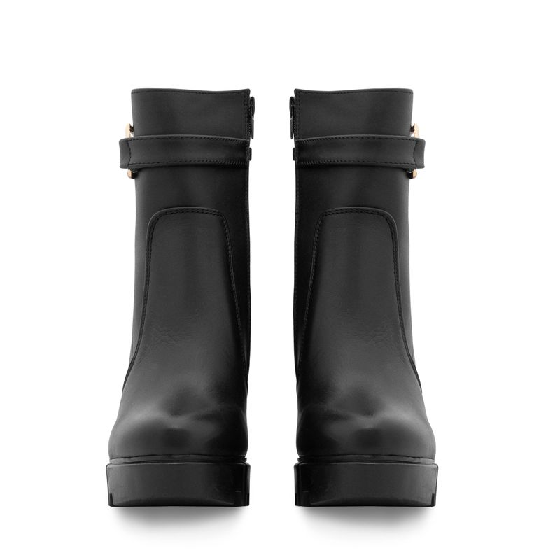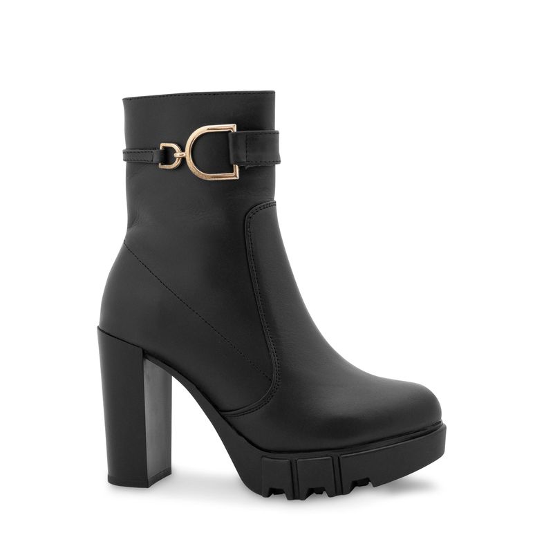 Este botín básico en color negro es la pieza clave que nunca pasa de moda, pero con un toque en tendencia. Su elegante hebilla en tono oro en el lateral le añade un detalle sutil y sofisticado, mientras que su tacón cómodo te permite lucir estilizada sin sacrificar confort. Perfecto para combinar con cualquier look, este botín es el equilibrio ideal entre sencillez y elegancia.