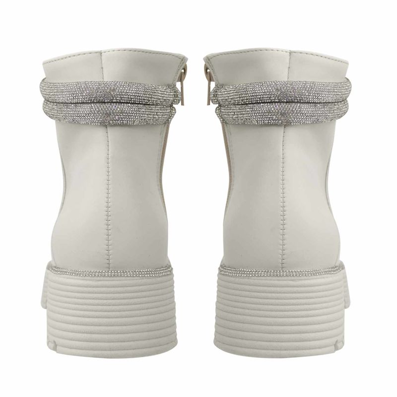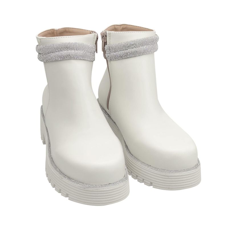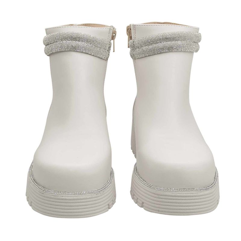 Estos botines son de otro mundo, este par tiene un diseño clásico con punta redonda, plantilla suave, suela antiderrapante, cierre lateral pero lo mejor es los detalles de pedrería que tiene en una cinta en la parte superior y en el borde de la suela y el botín. Este par te mantendrá cómoda pero elevará tu estilo por completo. Características: Material sintético | Color Latte | Pedrería | Cierre lateral | Altura suela 4 cm