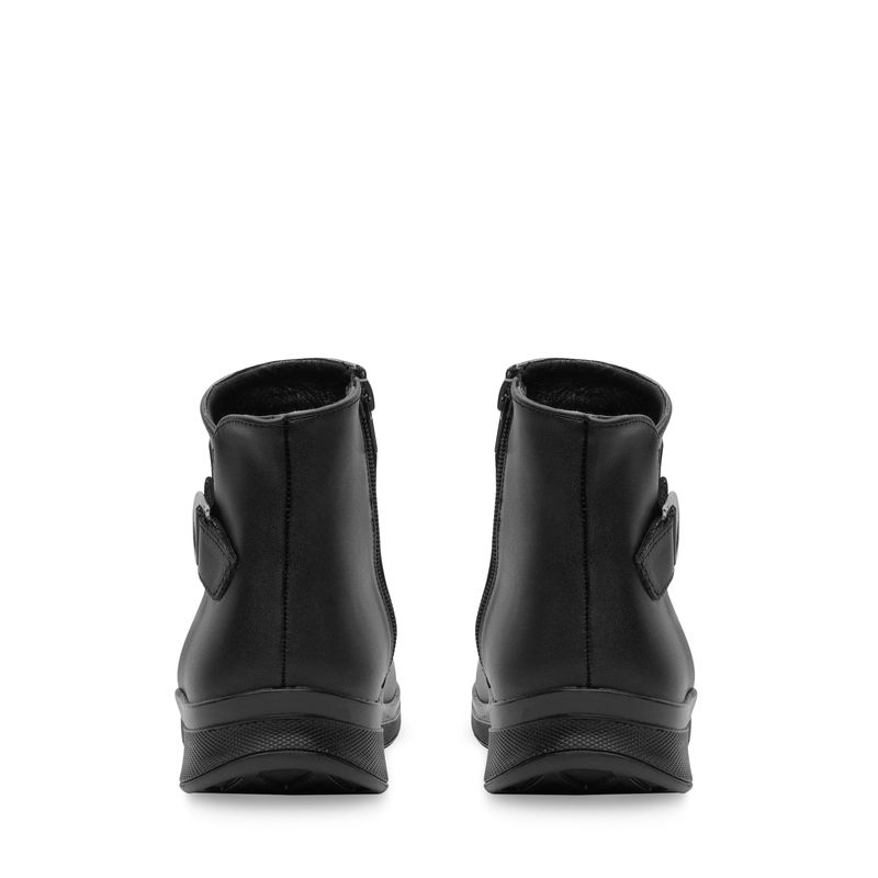 Este botín negro básico es el complemento perfecto para cualquier look, brindándote comodidad y estilo durante todo el día. Su suela cómoda y el detalle de cinta con hebilla en color plata añaden un toque de elegancia discreta que hace destacar su diseño clásico. Ideal para combinar con cualquier atuendo, es un básico imprescindible en tu guardarropa.