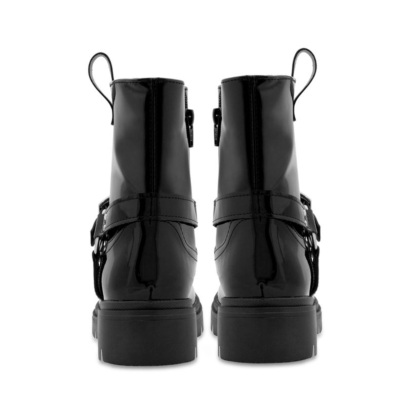 Eleva tu estilo con estos botines en color negro con una sofisticada textura de charol que añade un toque de elegancia. Su detalle distintivo de cintas con hebillas en tono plata crea un contraste moderno y audaz, ideal para destacar en cualquier look. Con un diseño en tendencia, estos botines no solo te ofrecen comodidad, sino también una apariencia atrevida y vanguardista, perfecta para cualquier ocasión.