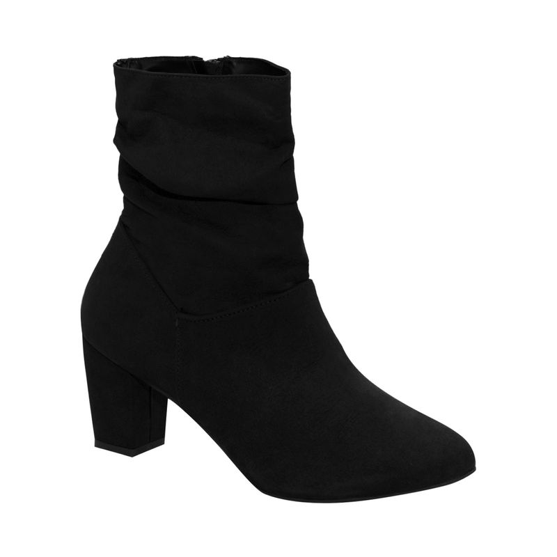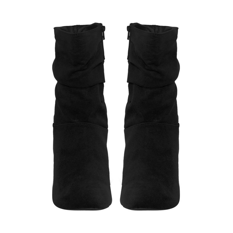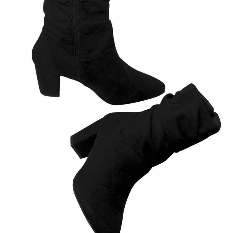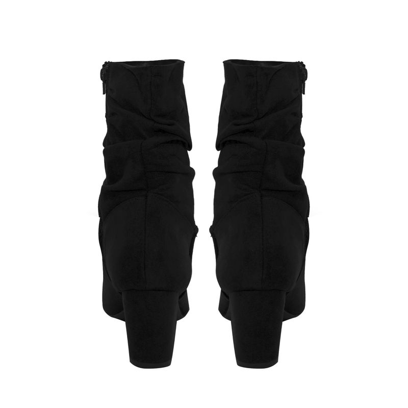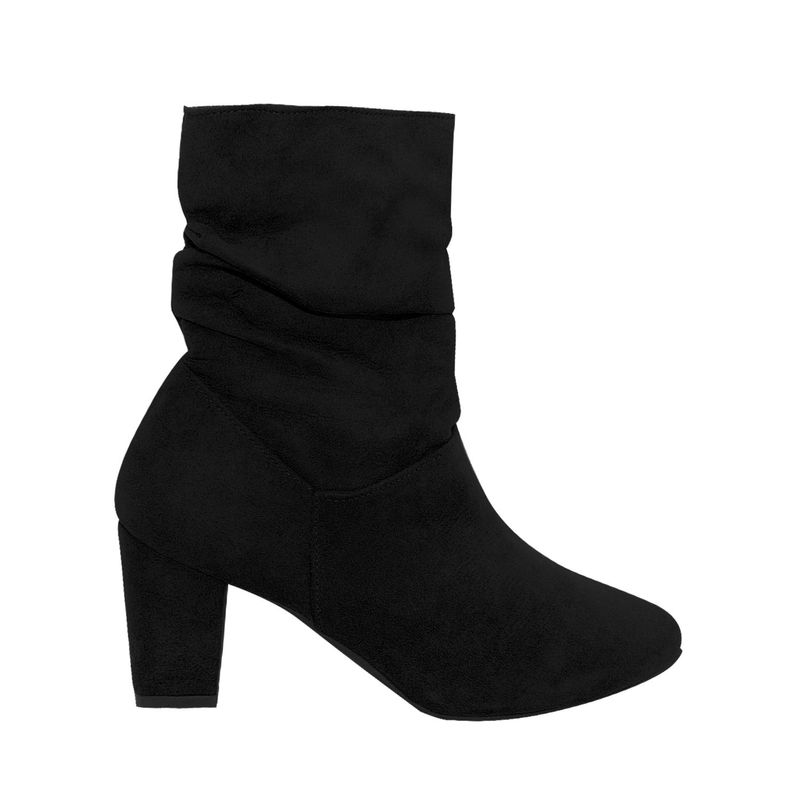 Amamos este par de botines que son ideales para complementar tu look y mantenerte cómoda en cualquier ocasión. Este par tiene textura de gamuza y tacón cuadrado para que la comodidad no sea un tema. Vas a amar por completo este par. Características: Material sintético | Color Negro |Altura tacón 8 cm