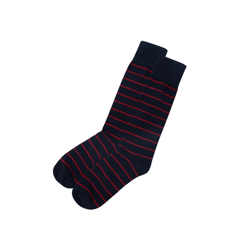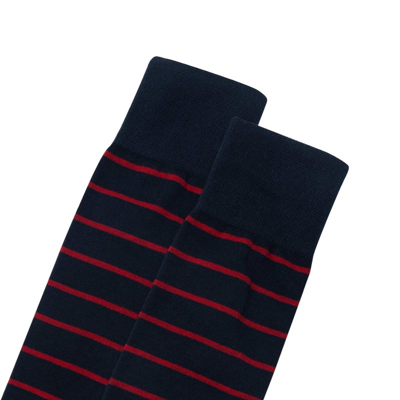 Calcetines en color azul marino con líneas horizontales rojas a lo largo de todo el diseño. Un contraste clásico y llamativo que añade un toque de estilo a cualquier outfit.