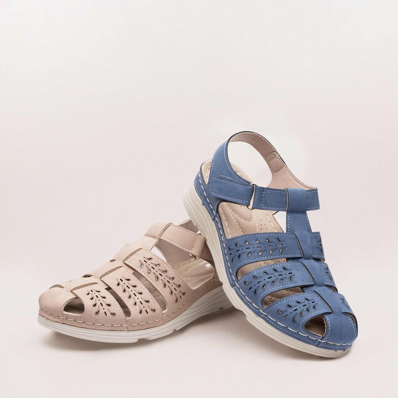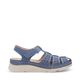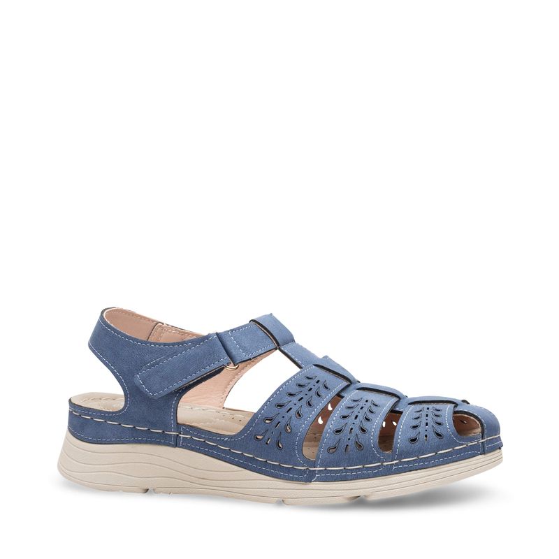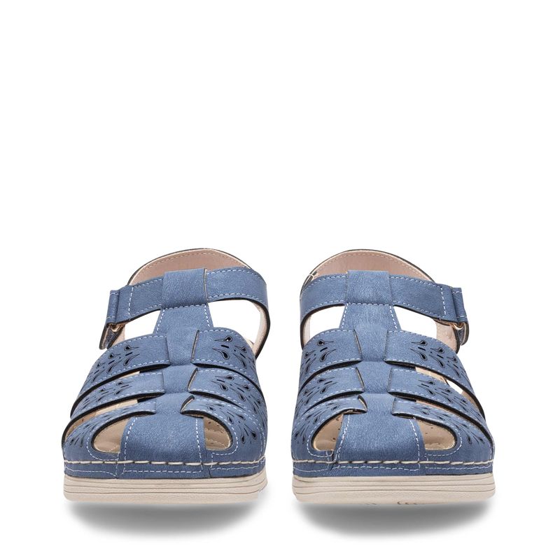 Sandalia de confort para dama en color azul, con un delicado diseño artesanal que combina estilo y funcionalidad. Presenta detalles decorativos en la cinta central y el empeine. Su práctica pulsera con cierre de velcro permite un ajuste cómodo y seguro. La suela en tono blanca, de acabado ligero y flexible, proporciona estabilidad y confort durante todo el día. Ideal para un look femenino, fresco y relajado.