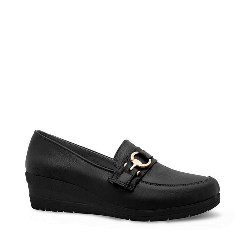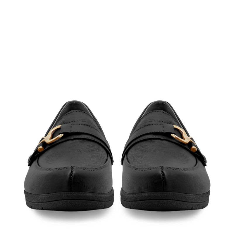 Añade un toque de elegancia a tu comodidad diaria con este calzado en color negro, diseñado para ofrecerte el máximo confort. Su característica más destacada es el detalle de hebilla dorada en la parte delantera, que aporta un acento sofisticado y moderno. La plantilla acolchada y la suela flexible aseguran que te sientas cómoda durante todo el día, sin sacrificar el estilo. Ideal para quienes buscan un calzado que combine funcionalidad y un toque de lujo, este modelo es perfecto para acompañarte en cualquier ocasión.