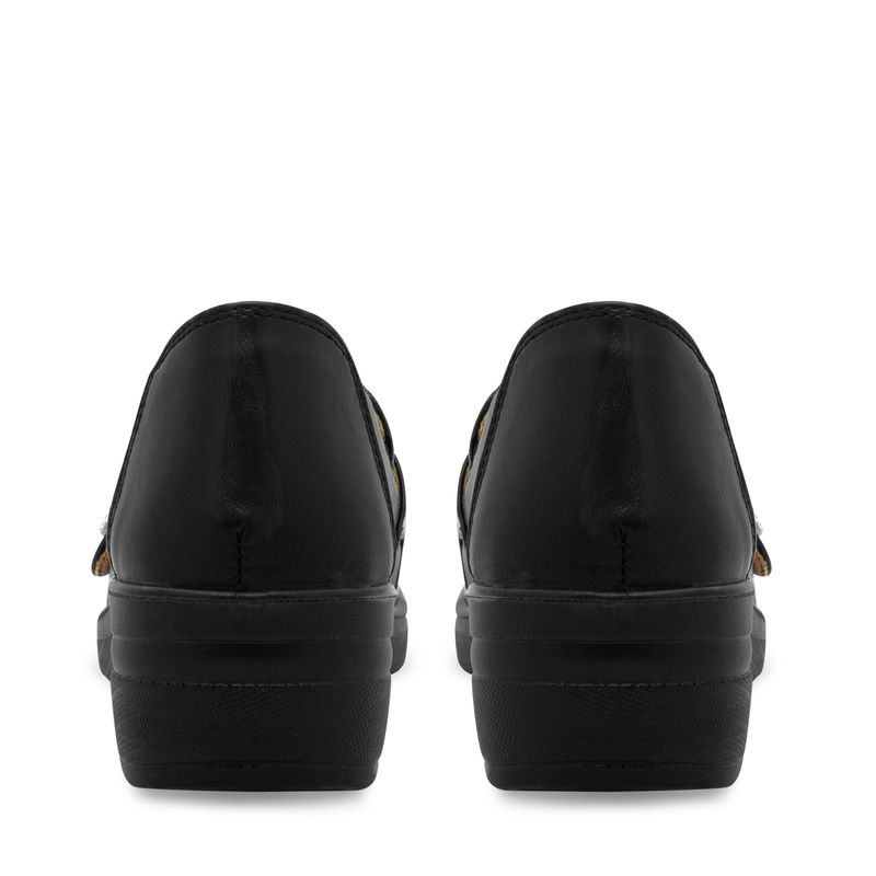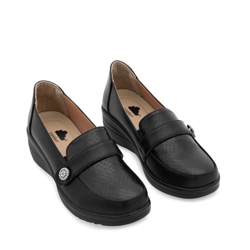 Este calzado confort en color negro combina elegancia y comodidad en un diseño sofisticado. La textura de croco en la parte frontal le añade un toque de lujo, mientras que el detalle de pin con brillos aporta un toque sutil de glamour. Con un tacón bajo y ultra cómodo, estos zapatos son ideales para lucir con estilo durante todo el día sin sacrificar el confort.