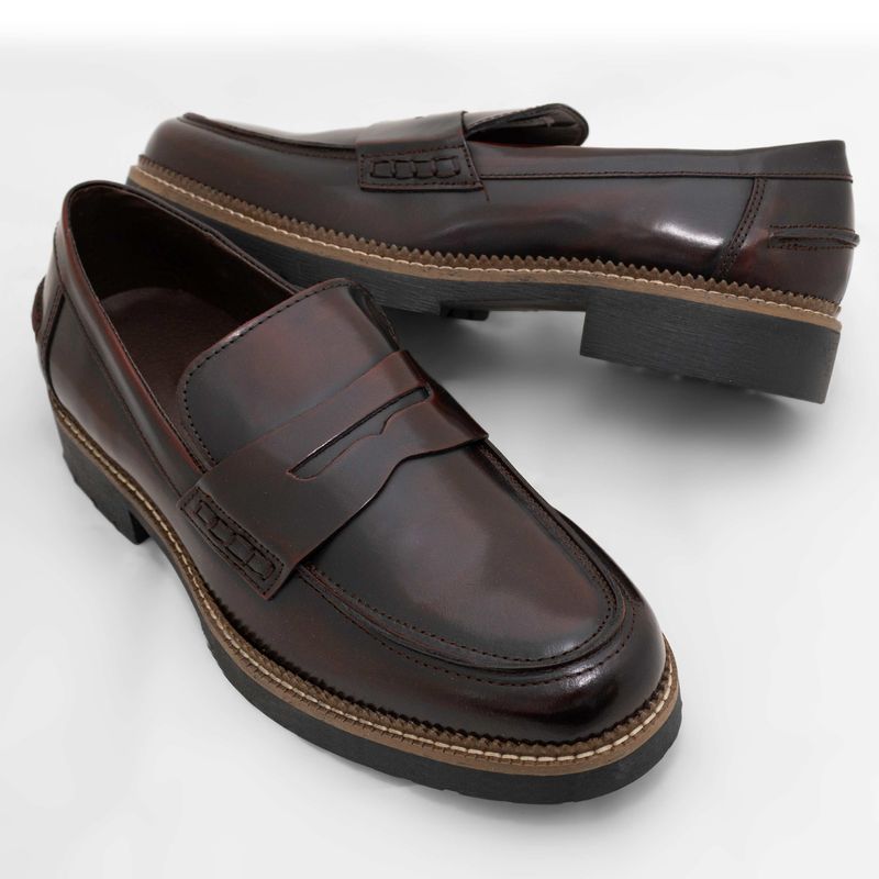 Añade un toque de sofisticación a tu calzado diario con nuestros mocasines color vino básicos. Diseñados para adaptarse a cualquier ocasión, estos mocasines destacan por una elegante tira en tono café que rodea el calzado, ofreciendo un detalle único y refinado.