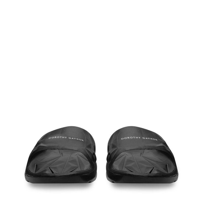 Esta sandalia slide negra está diseñada para acompañarte con la máxima comodidad en cada paso. Su estructura de una sola pieza presenta un diseño geométrico moderno con cortes laterales que favorecen la ventilación y le dan un look vanguardista. La plantilla tiene un acabado texturizado que brinda una sensación acolchonada y un agarre ligero al caminar, ideal para el uso diario.