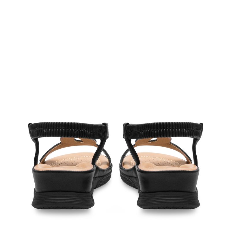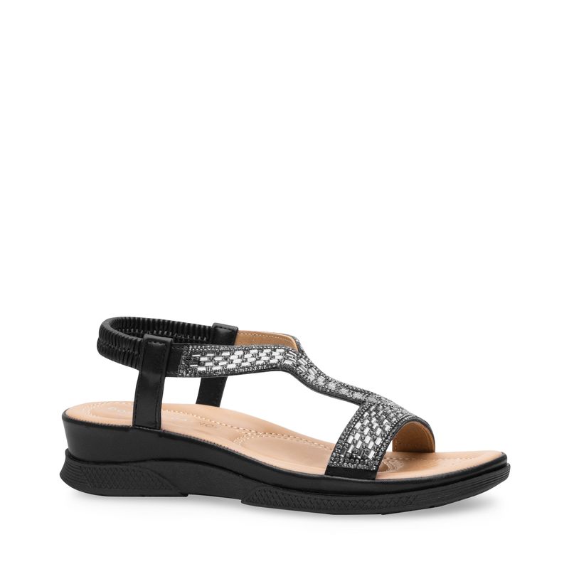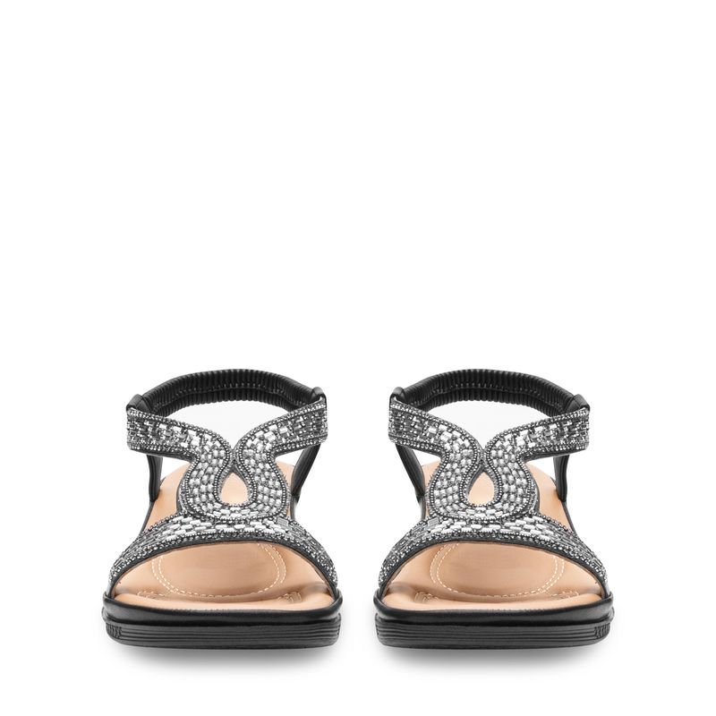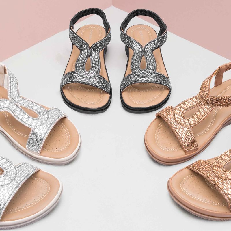 Eleva tu estilo diario con esta sandalia negra decorada con pedrería brillante que aporta un toque sofisticado sin perder comodidad. Su diseño con pulsera elástica se ajusta perfectamente al pie, brindando libertad de movimiento y un ajuste suave durante todo el día. La plantilla suave y la plataforma ultraligera hacen que cada paso sea más cómodo, convirtiéndola en la opción perfecta para paseos largos, outfits casuales y looks que buscan un toque de elegancia relajada.