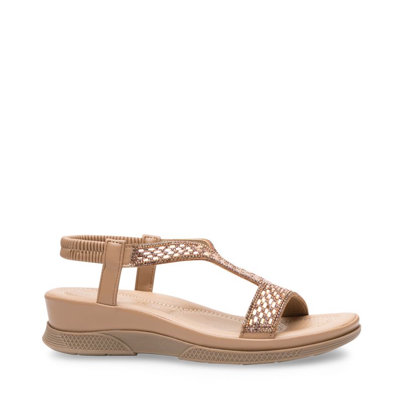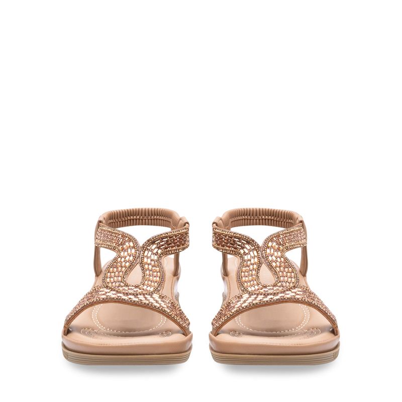 Eleva tu estilo diario con esta sandalia oro decorada con pedrería brillante que aporta un toque sofisticado sin perder comodidad. Su diseño con pulsera elástica se ajusta perfectamente al pie, brindando libertad de movimiento y un ajuste suave durante todo el día. La plantilla suave y la plataforma ultraligera hacen que cada paso sea más cómodo, convirtiéndola en la opción perfecta para paseos largos, outfits casuales y looks que buscan un toque de elegancia relajada.
