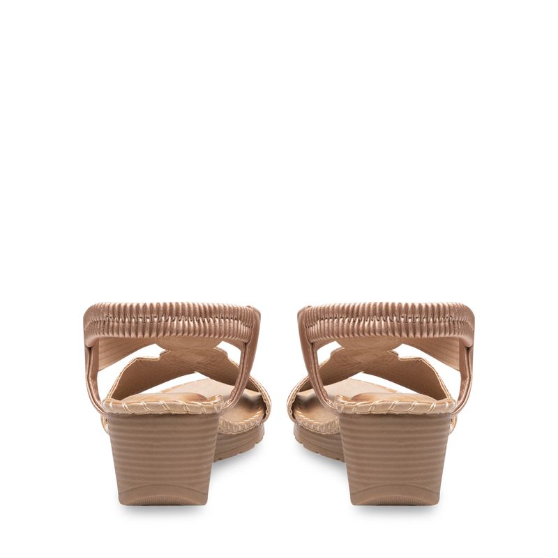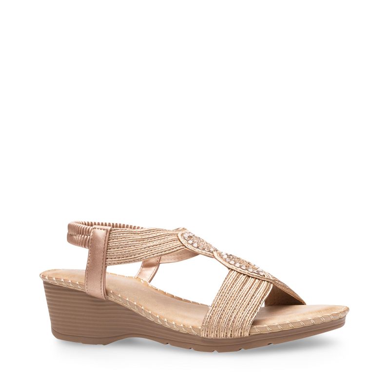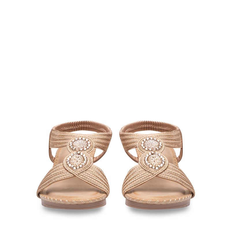 Esta sandalia destaca por sus tiras doradas con textura finamente tejida, que envuelven el empeine de forma elegante. En el centro luce tres aplicaciones ovaladas con pedrería rodeada de cristales, creando un efecto luminoso que realza cualquier look. La plantilla en acabado dorado añade armonía al diseño, mientras que la pulsera elástica trasera asegura un ajuste cómodo y flexible. Perfecta para eventos, tardes especiales o para elevar un outfit casual con un toque de brillo.