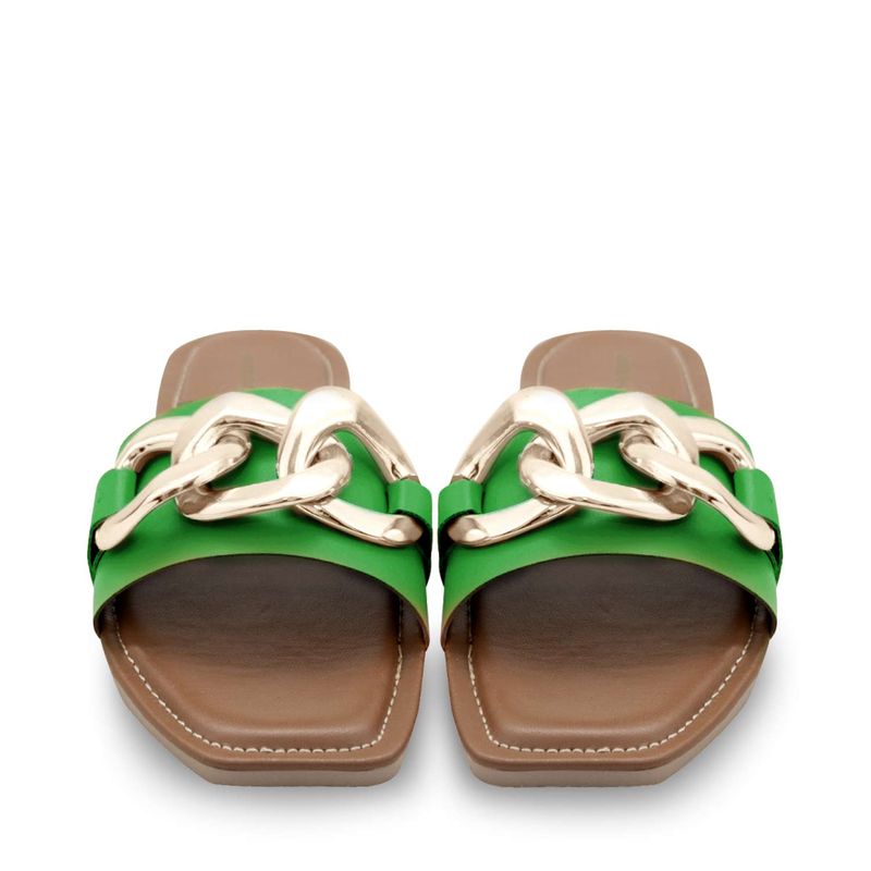 Este par de sandalias son de los básicos que siempre debes de tener. Este par tienen un diseño increíble que te permitirá estar cómoda y descansar en cualquier ocasión. Este par tiene un diseño clásico con punta cuadrada, plantilla suave, un toque de color naranja en la cinta principal y una cadena dorada. Este par es de los que te harán lucir espectacular. Características. Material sintético | Color Verde | Cadena Dorada |Altura suela 1 cm