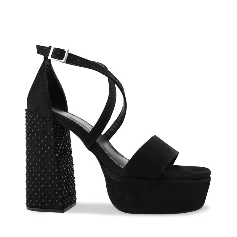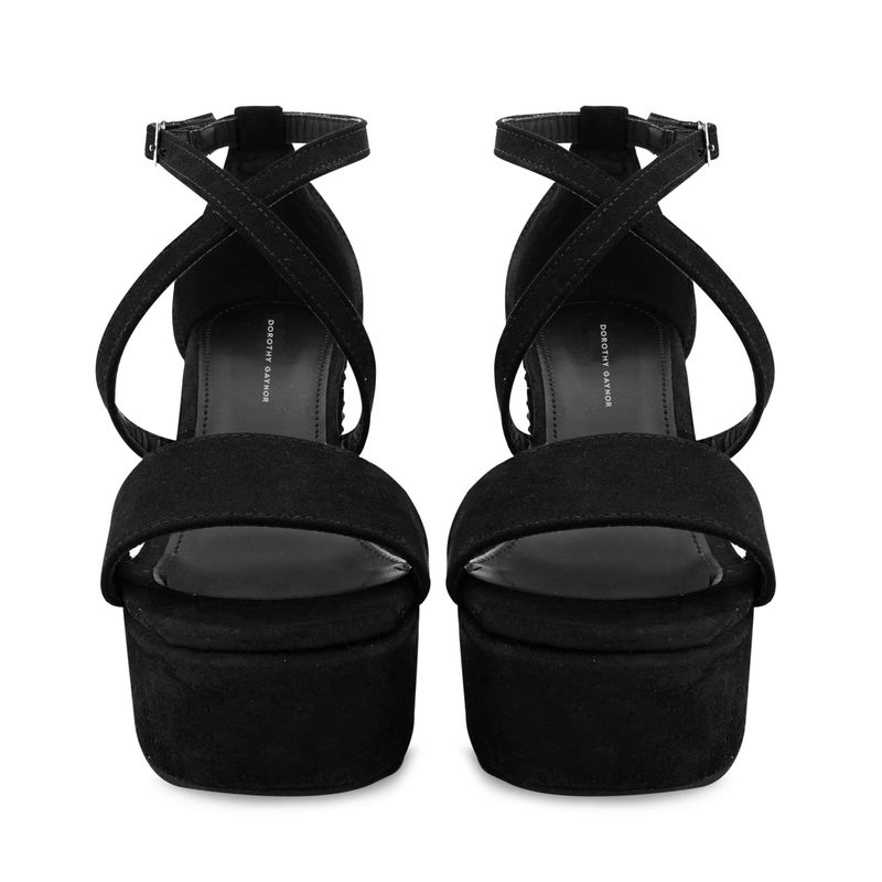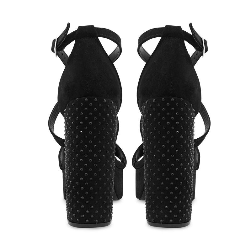 Destaca con elegancia y un toque de glamour con esta sandalia en color negro. Su diseño sofisticado se realza con un tacón adornado con brillos, añadiendo un detalle especial que captura todas las miradas. Las cintas cruzadas en la parte delantera ofrecen un ajuste seguro y estilizado, mientras que la correa ajustable con hebilla en el tobillo asegura una sujeción personalizada y cómoda. Ideal para ocasiones especiales, esta sandalia es la elección perfecta para brillar con estilo.