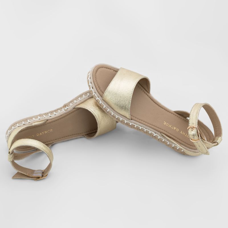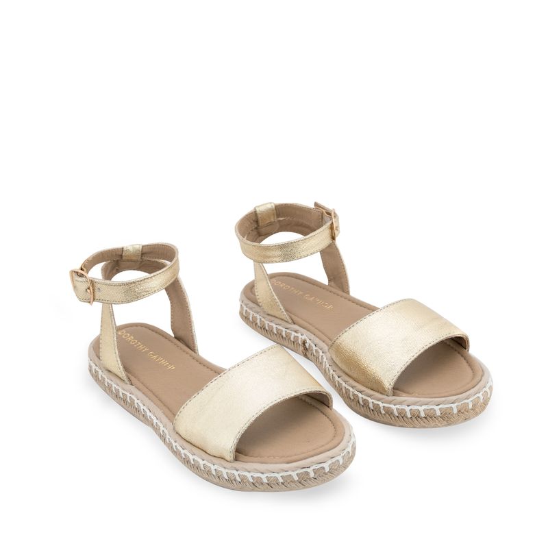 Descubre el equilibrio perfecto entre elegancia y estilo natural con estas sandalias en color oro. La suela de yute añade un toque rústico y veraniego, mientras que la cinta central en oro brillante proporciona un destello de glamour. La cinta ajustable con hebilla asegura un ajuste cómodo y personalizado, haciéndolas perfectas para cualquier ocasión.