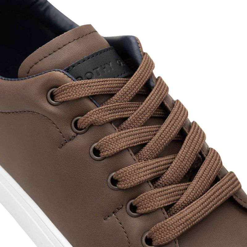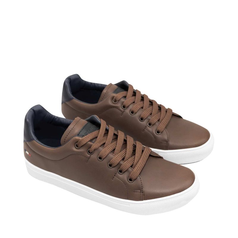 Estos tenis serán imprescindibles en tu clóset, este par tiene un diseño básico con punta redonda, agujetas, plantilla suave y un toque de color azul marino que te permitirá hacer las mejores combinaciones para cualquier ocasión. Características: Material sintético | Color Cognac | Agujetas | Toque de color azul | Altura suela 2 cm
