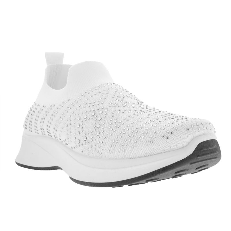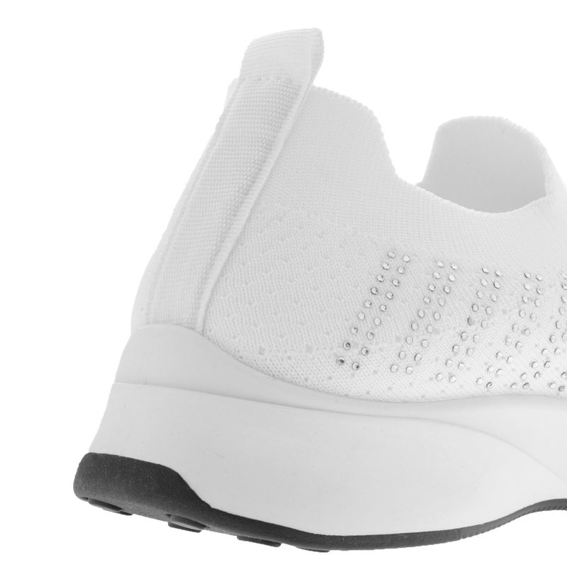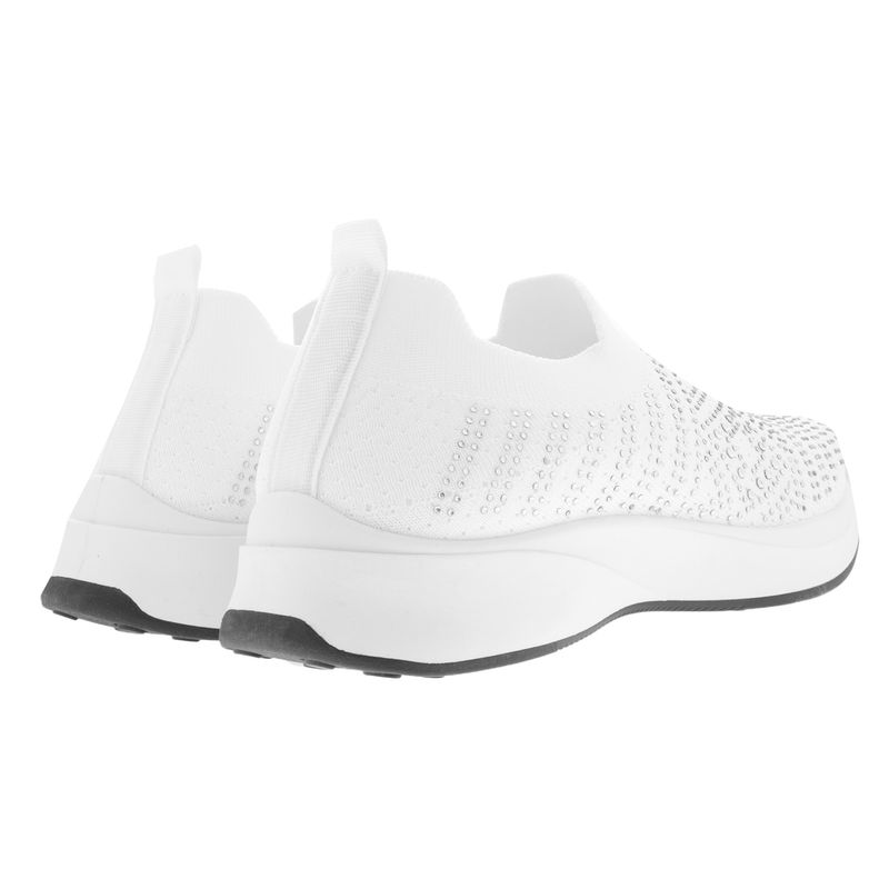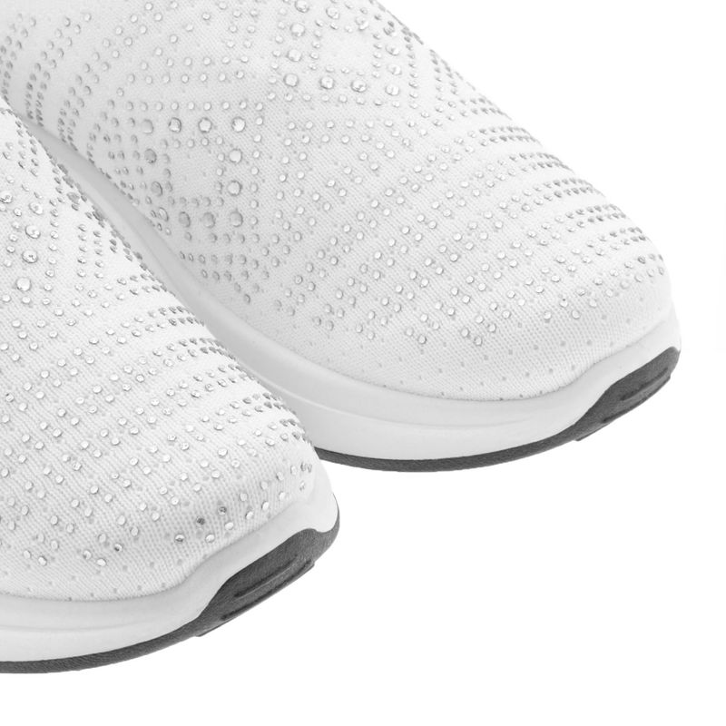 Luce increíble y cómoda con este par de tenis tipo calceta en color blanco, cuentan con un diseño de pedrería en tonos plateados que le dan ese toque único para que luzcas a la moda a cualquier lugar que vayas, además cuentan con una suela corrida y suave que te brindaran la comodidad y seguridad perfecta en todo tu día. Características: Material sintético | Color Blanco| Detalle pedrería| Confort | Altura suela 3 cm | Ajustables a tu pie