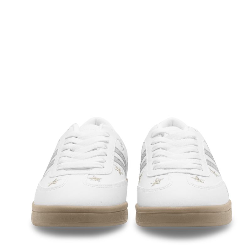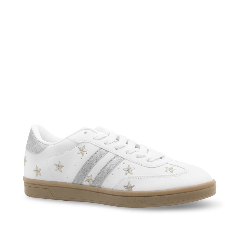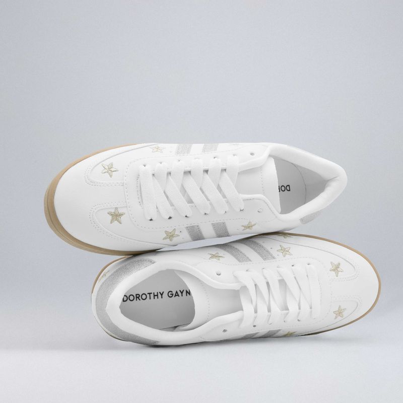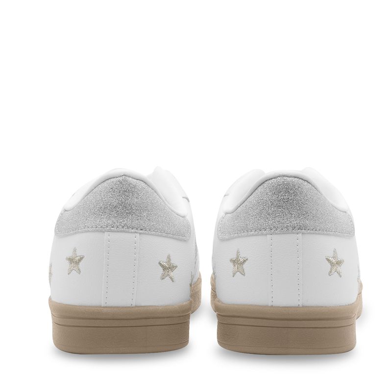Estos tenis combinan estilo y diversión gracias a sus aplicaciones de estrellas en glitter plateado. Las franjas laterales con acabado brillante aportan un toque moderno, mientras que la suela color caramelo ofrece contraste y comodidad. Fabricados en material tipo piel, son ligeros, versátiles y perfectos para elevar tus looks casuales con detalles que iluminan cada paso.