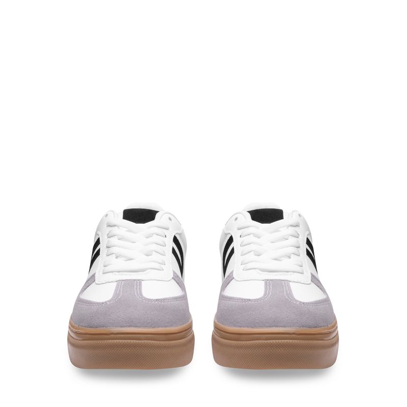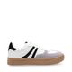 Estos tenis en tono blanco se complementan con aplicaciones grises y negras que añaden un toque femenino. Combinan materiales lisos y tipo gamuza para darle una textura visual más rica y moderna. La suela en tono miel aporta un contraste cálido y una estética retro muy en tendencia.