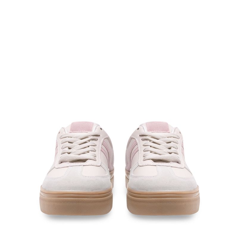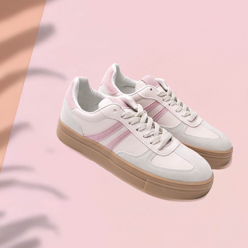 Estos tenis en tono rosa claro se complementan con aplicaciones grises que añaden un toque femenino. Combinan materiales lisos y tipo gamuza para darle una textura visual más rica y moderna. La suela en tono miel aporta un contraste cálido y una estética retro muy en tendencia.