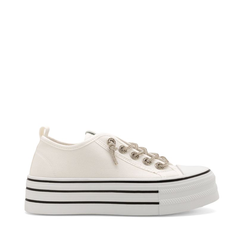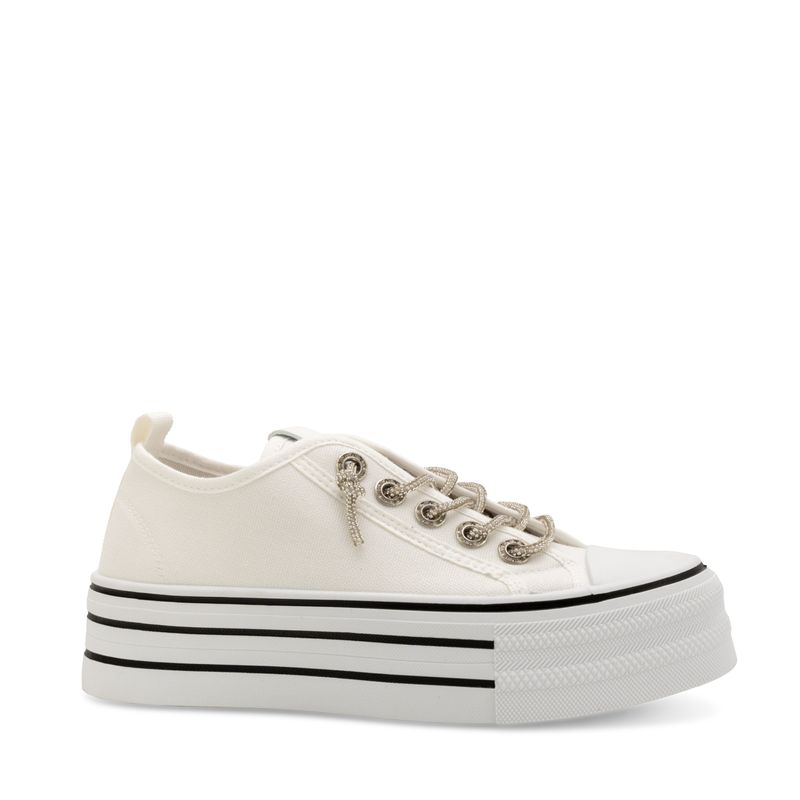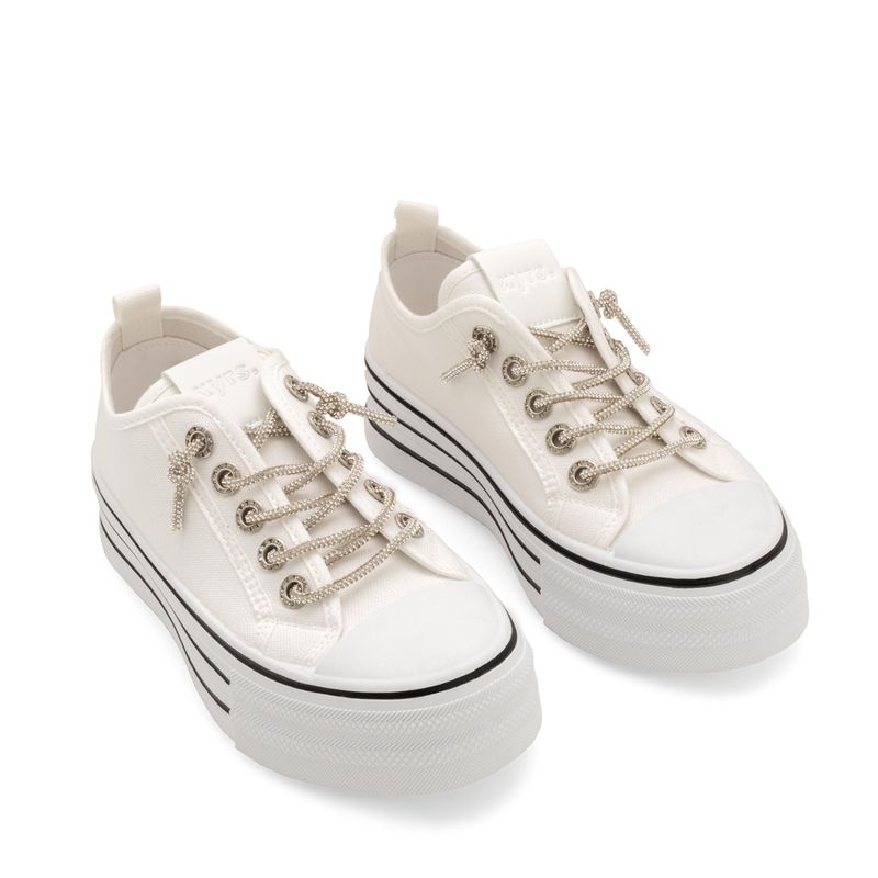 Destaca con estos tenis en color blanco, que combinan una increíble textura de mezclilla con detalles únicos. Las cintas ajustables con brillos añaden un toque distintivo y moderno, haciendo de este par una opción ideal para quienes buscan resaltar. Su suela alta no solo proporciona comodidad, sino también un look urbano que complementa cualquier outfit. Perfectos para darle un giro fresco y a la moda a tu día a día.