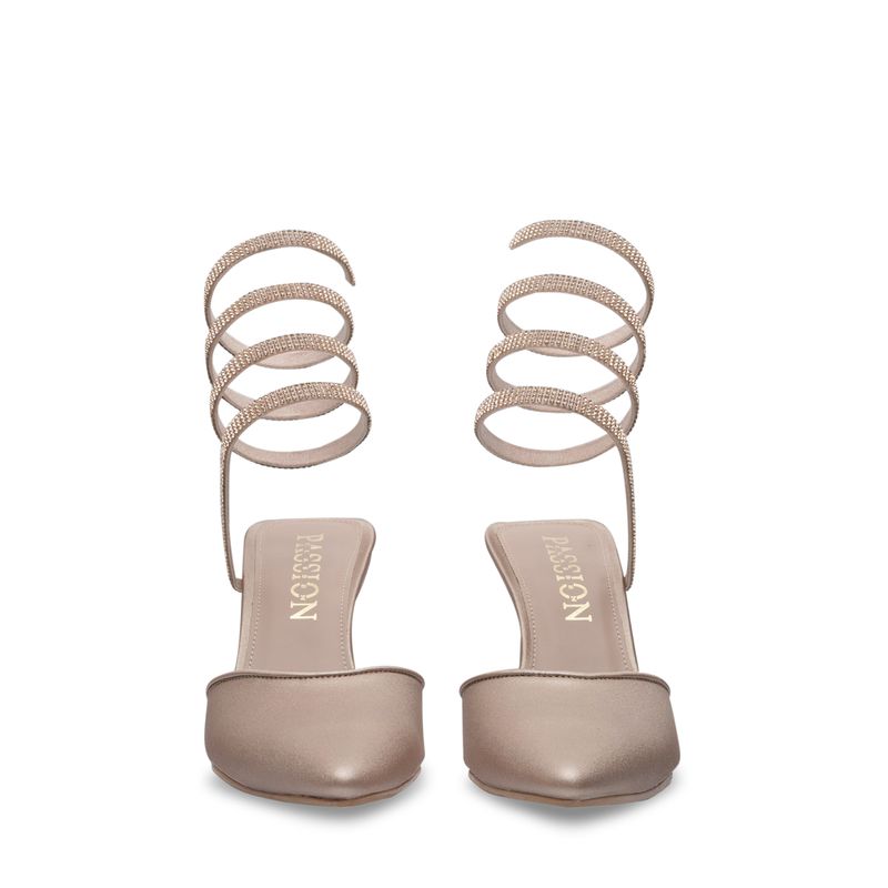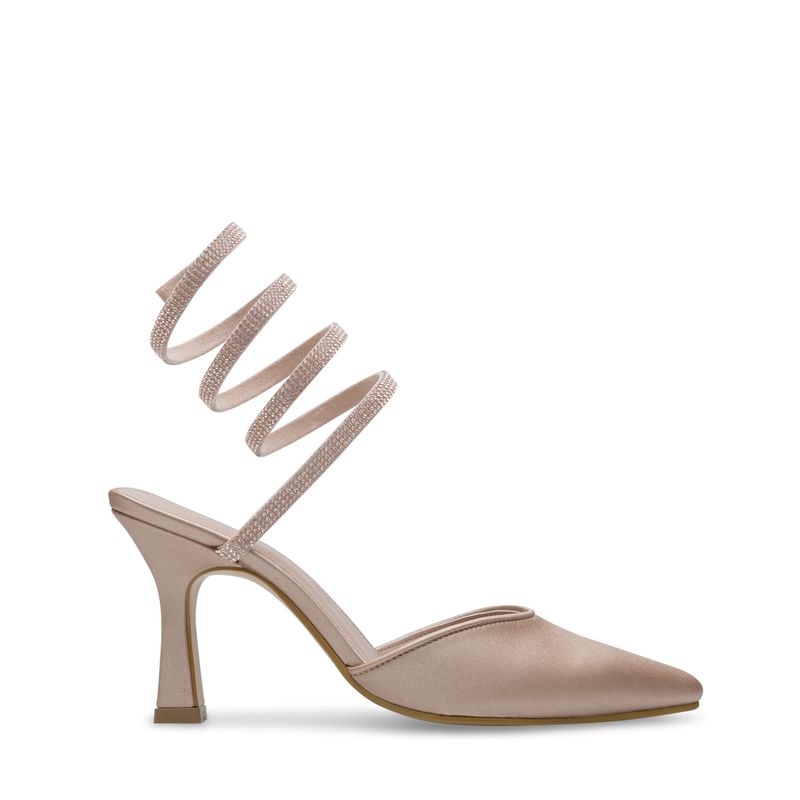 Luce deslumbrante con esta espectacular zapatilla en color rosa champagne, diseñada para realzar tu elegancia en cada paso. Su distintiva cinta tipo resorte con brillos rodea delicadamente el tobillo y se extiende hacia arriba, creando un diseño sofisticado y único que captura todas las miradas. La punta puntal aporta un toque chic y estilizado, ideal para complementar outfits elegantes o darle un giro glamuroso a tus looks más modernos. Perfecta para ocasiones especiales, esta zapatilla combina estilo y comodidad, permitiéndote brillar con confianza en cualquier lugar.