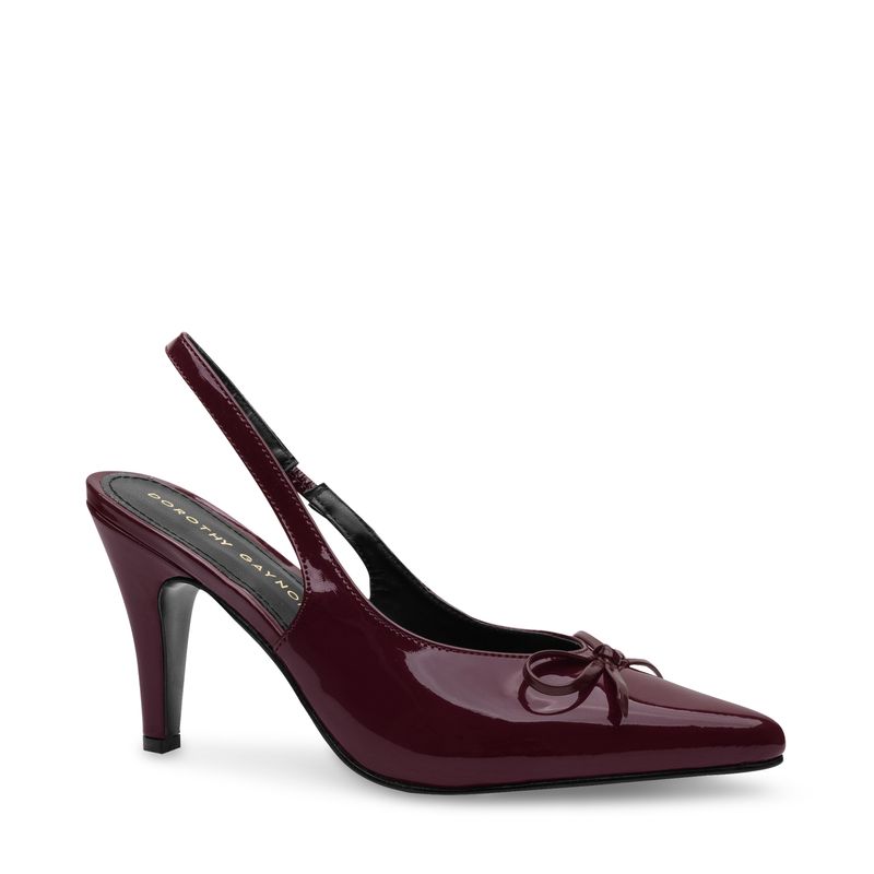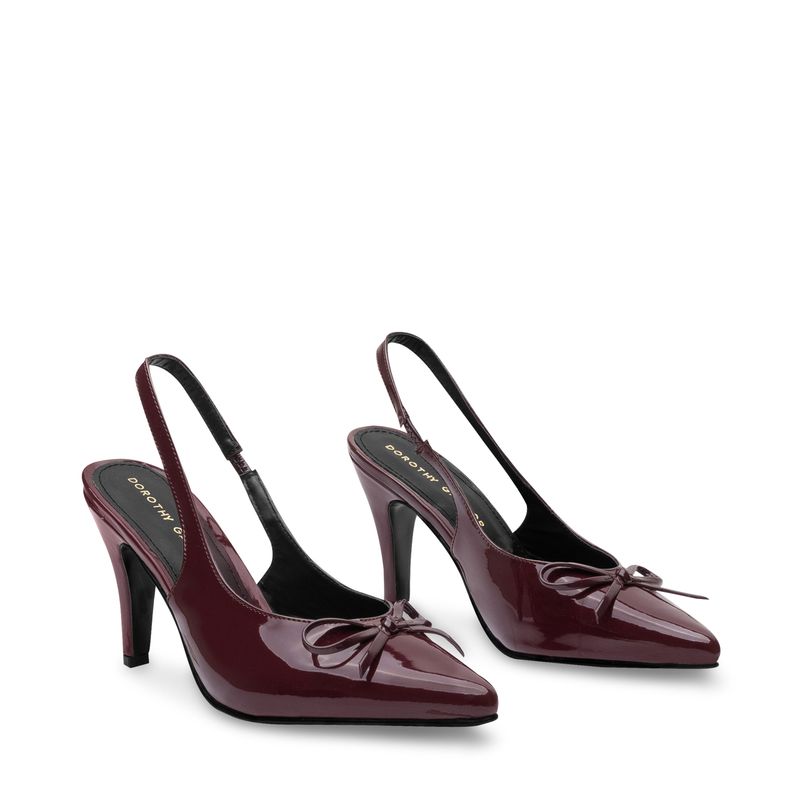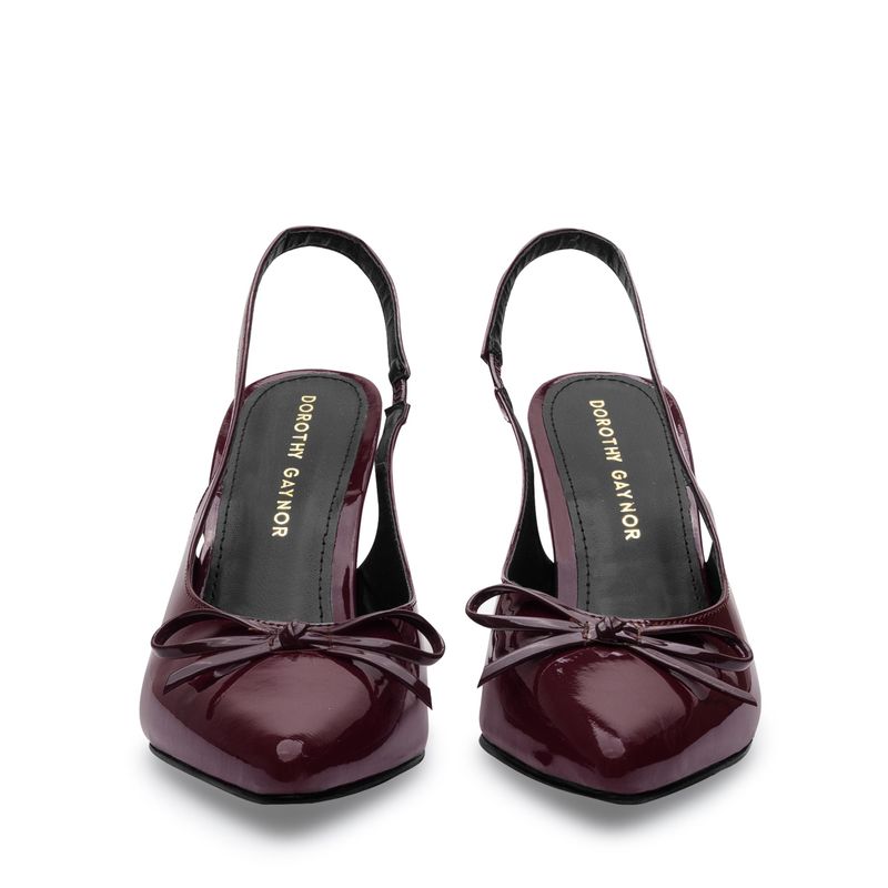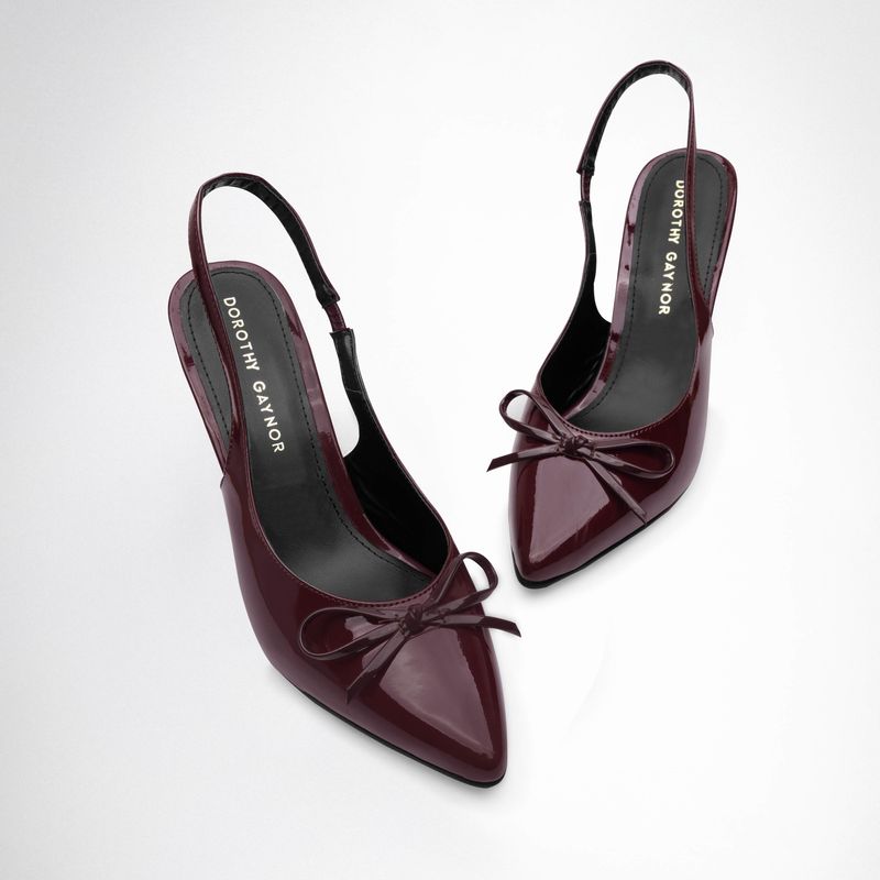 Esta zapatilla destaca por su silueta estilizada con punta fina y su acabado brillante en tono vino, que aporta sofisticación instantánea. En el empeine, un moño delicado se convierte en el detalle protagonista: sutil, moderno y encantador. El tacón ofrece altura con un soporte estable. El diseño descubierto en el talón y la correa delgada aportan frescura y un ajuste cómodo.