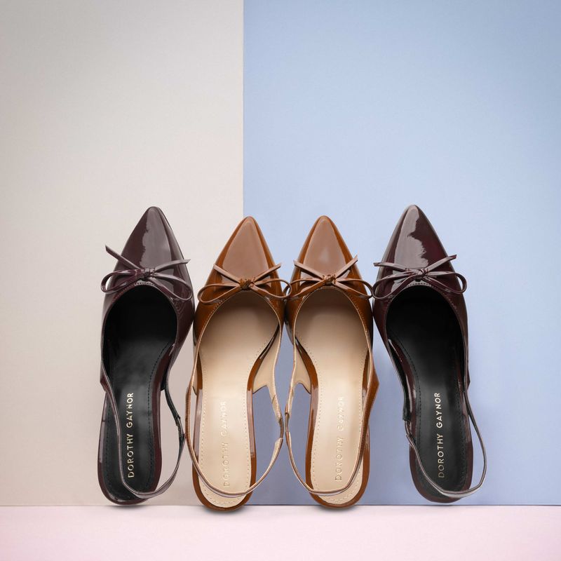 Esta zapatilla destaca por su silueta estilizada con punta fina y su acabado brillante en tono café, que aporta sofisticación instantánea. En el empeine, un moño delicado se convierte en el detalle protagonista: sutil, moderno y encantador. El tacón ofrece altura con un soporte estable. El diseño descubierto en el talón y la correa delgada aportan frescura y un ajuste cómodo.
