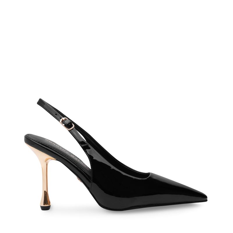 Su acabado brillante aporta sofisticación inmediata, mientras que la silueta puntiaguda estiliza visualmente el pie y alarga la figura. La correa trasera ajustable asegura un calce perfecto y cómodo, ideal para llevar durante horas.El protagonista del diseño es su espectacular tacón dorado tipo gota, una pieza escultural que aporta un efecto de lujo y alta moda a cada paso.