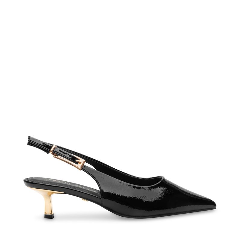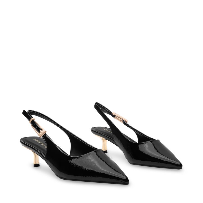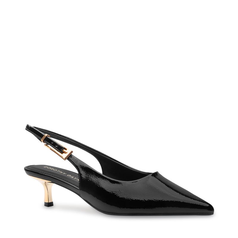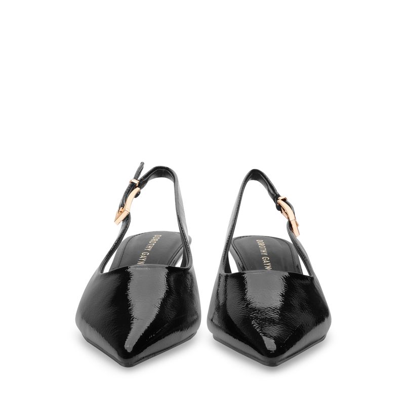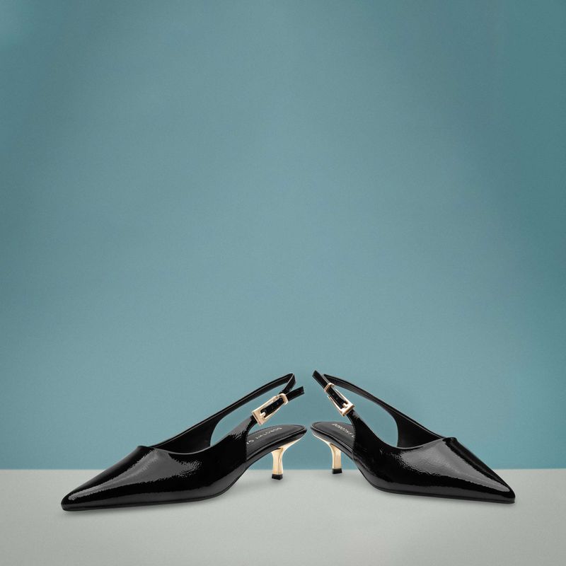 Zapatilla en tono negro, delicado y femenino, confeccionada en material tipo charol que aporta un brillo elegante y sofisticado. Su diseño estilizado con terminación en punta alarga visualmente la silueta del pie, mientras que el tacón pequeño en acabado dorado añade un contraste sutil y lujoso. La cinta ajustable con hebilla dorada no solo aporta un detalle de brillo sutil, sino que también asegura un calce cómodo y personalizado.